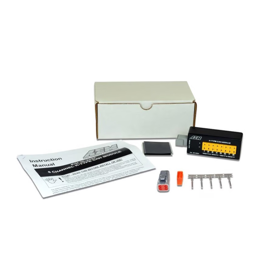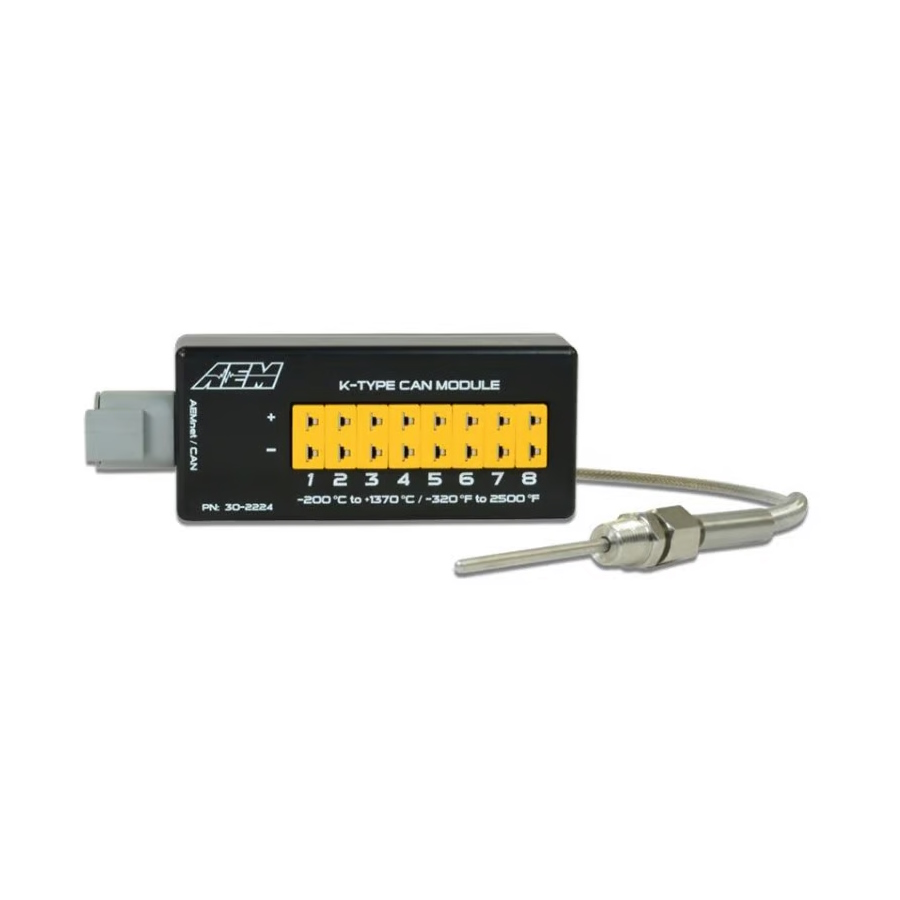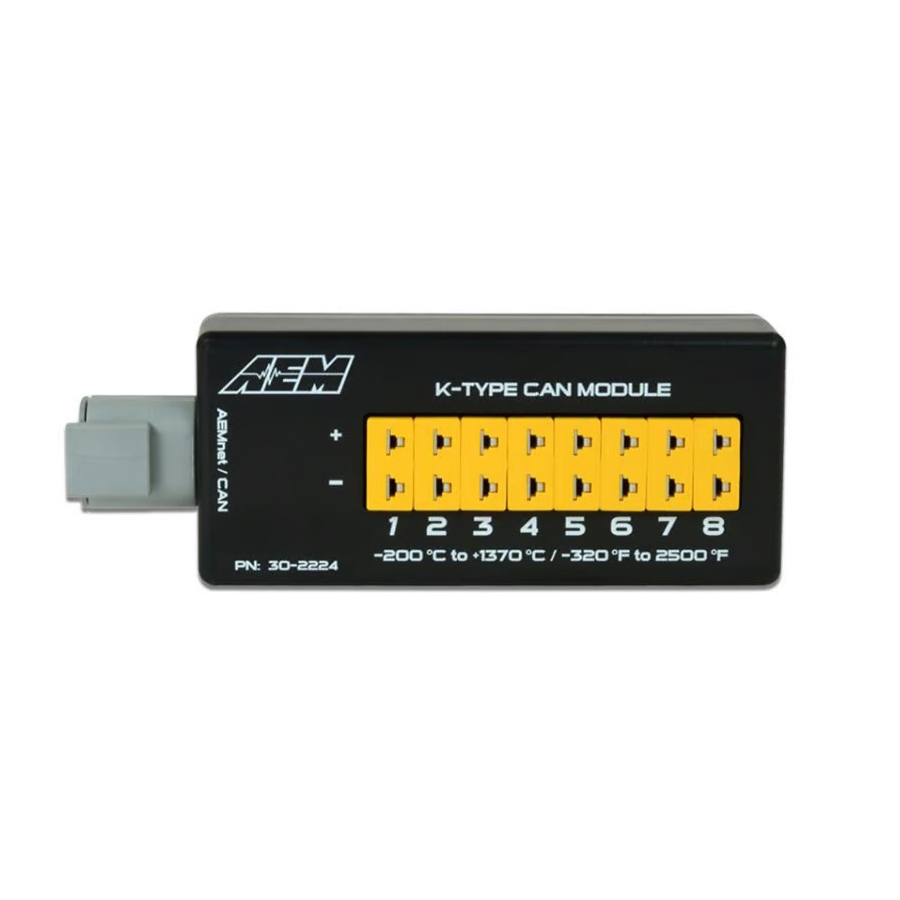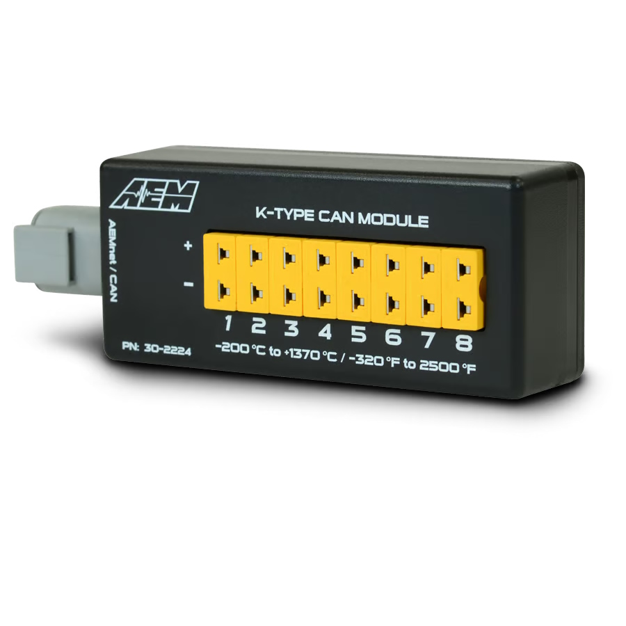 AEM’s 8-Channel K-Type Thermocouple EGT CAN Module (PN 30-2224) allows racers and enthusiasts to install eight K-type thermocouple sensors onto their vehicle and transmit all 8 temp channels to a CD Carbon Digital Dash or 3rd Party programmable CAN device via a one-plug CAN bus connection. It connects out of the box to AEM’s CD Digital Dashes and it can be configured to send data to virtually any CAN-based receiving device that has programmable CAN bus capability!
